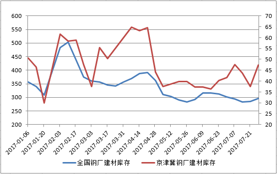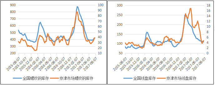 圖一鋼廠各品種盈利情況 圖一可以看到,今年鋼廠一舉扭虧,一直保持較高的利潤水平,特別是5月下旬至今,螺紋鋼利潤一直保持850-1000元/噸,而在此期間,熱卷和帶鋼則是隨著市場庫存下降,保持較為緩慢的盈利上升通道,直到7月中旬盈利到達700元/噸以上,進入8月份帶鋼的噸鋼利潤已經上升至1000元/噸,而螺紋與熱卷的噸鋼利潤基本持平在900元/噸左右。 7月份最搶眼的當然還是唐山鋼坯,調坯軋材企業采購鋼坯,由于螺紋鋼與鋼坯的價差不夠軋制費,只能暫停生產,囤坯賣坯來獲取利潤。唐山最為最大的鋼材生產基地,竟然出現了外地鋼坯賣至唐山的情況。可見唐山鋼坯在風口浪尖上,噸鋼利潤達到900元/噸,可以說是“史無前例”,調坯螺紋廠軋螺紋不如買鋼坯,外地坯賣到了唐山。再這樣下去,全流程鋼廠都去賣坯,少一道軋材的工序還能多掙錢!鋼坯的領漲之路還能走多遠值得我們深思。 建材鋼廠庫存與市場庫存均見拐點 進入7月中旬后全國建材庫存和京津冀建材庫存均出現見底反彈的趨勢,見圖二。進入淡季,鋼廠庫存消化速度減慢,而京津冀地區價格偏高,也導致資源向外分流困難。