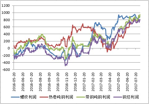 在供給側改革的推動下,鋼廠一直保持較高的利潤空間,但仍然難以阻擋價格上漲的腳步。供暖季鋼企限產50%的消息持續持續炒作,但當前淡季后,下游需求受到一定影響。雖然市場一致性看漲,但漲速過快,也出現了明顯的恐高心理。熱卷價格已經突破4000元/噸,螺紋價格距離4000元/噸也僅有一步之遙,上漲之路還能走多遠! 當前市場現狀: 1、 淡季不淡,漲價氛圍熱火朝天,金九銀十,價格能否支撐,是當前市場最迷茫的; 2、 期螺1710從最多貼水600元/噸,到現在已經實現100元/噸左右的升水,之前現貨帶動期貨反彈,但現在期貨能對現貨實現怎樣的拉動! 3、 鋼廠持續暴利,從生產工藝看,鋼坯的利潤最大,而從鋼坯到成材的軋制利潤卻并不大,后期鋼廠供應品種會主要集中在那些品種,也是值得我們關注的。 全流程鋼廠暴利 調坯軋材卻盈利困難 今年鋼廠一直保持較好的盈利狀況。春節過后,成材上漲,礦石、煤焦等原料并沒有同明顯的跟隨,其中螺紋的盈利狀況最好,這主要歸功于國家供給側改革的力度,6月30日徹底鏟除中頻爐,對建筑鋼材的供應量影響最大,以至于在上半年,其他品種調整時期,只有建筑鋼材一枝獨秀,逆勢高位震蕩。圖一為近一年鋼廠各品種盈利狀況走勢。