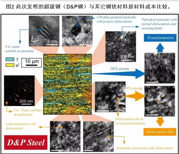 此外,該鋼還有兩大優點。第一,成本較低。這種超級鋼是成分簡單的中錳鋼成分體系,含有10%錳、0.47%碳、2%鋁、0.7%釩,這些都是現在廣泛使用的鋼材料中常見的合金元素,并沒有通過大量使用昂貴的合金元素來提高強韌性;第二,該鋼是通過工業界廣泛使用的加工工藝來制備,如熱軋、冷軋、熱處理等常規工業制備工藝,而不是采用那些難以規模化工業生產的特殊加工工藝來制備。因此,這種超級鋼具備在鋼鐵企業進行百噸級規模工業化生產的潛力。