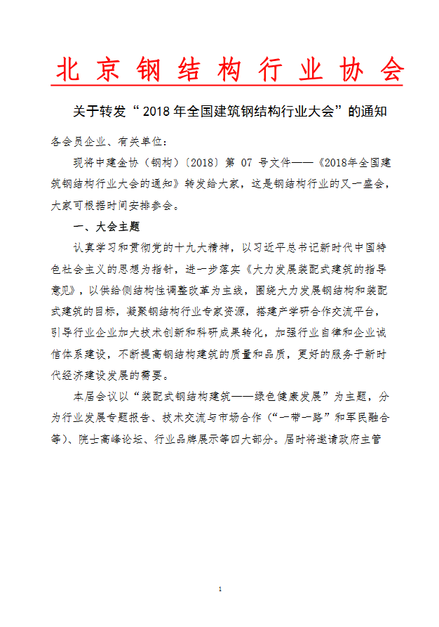 北鋼協關于轉發“ 2018 年全國建筑鋼結構行業大會”的通知